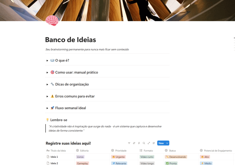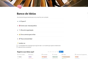 Neste banco inteligente, cada insight tem espaço para viver, categorizado por editoria, prioridade e formato. É como ter um cofre criativo sempre à mão.