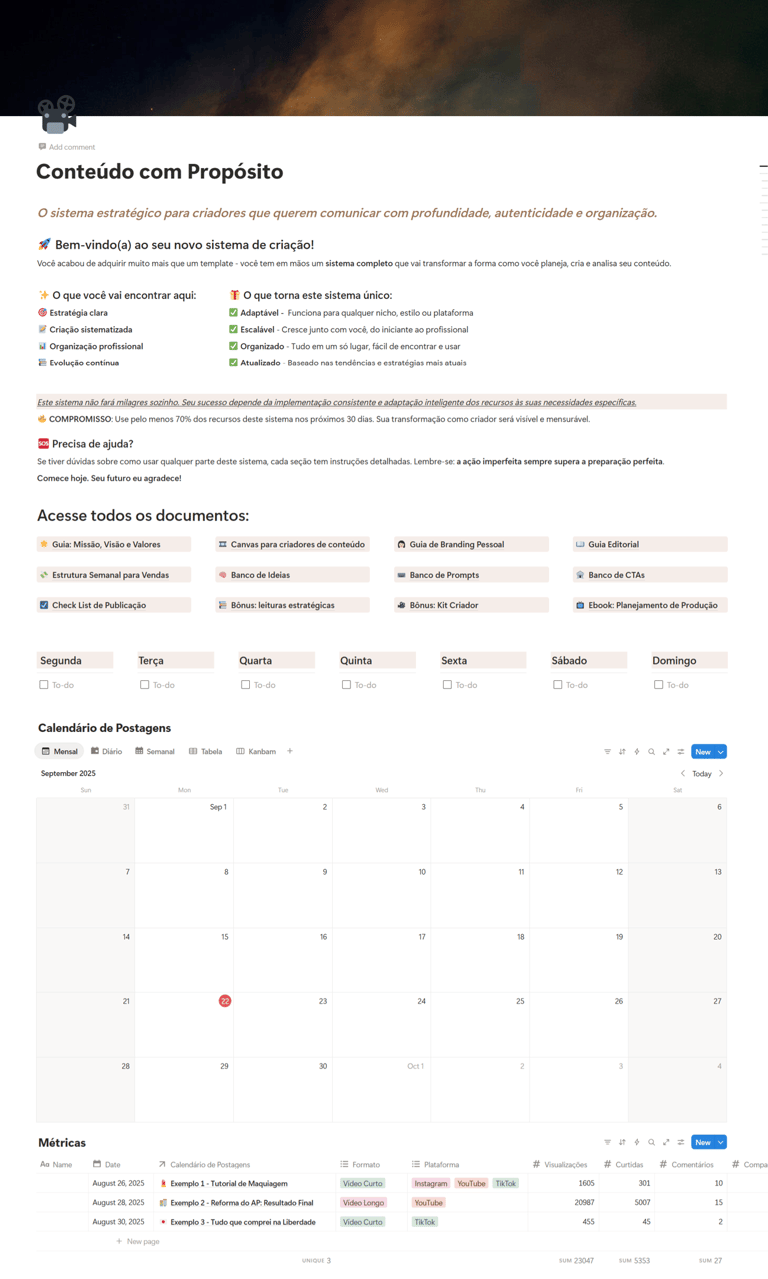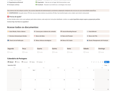 Você terá tudo centralizado no Notion, em um sistema que é seu para sempre, sem depender de assinaturas mensais.