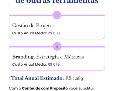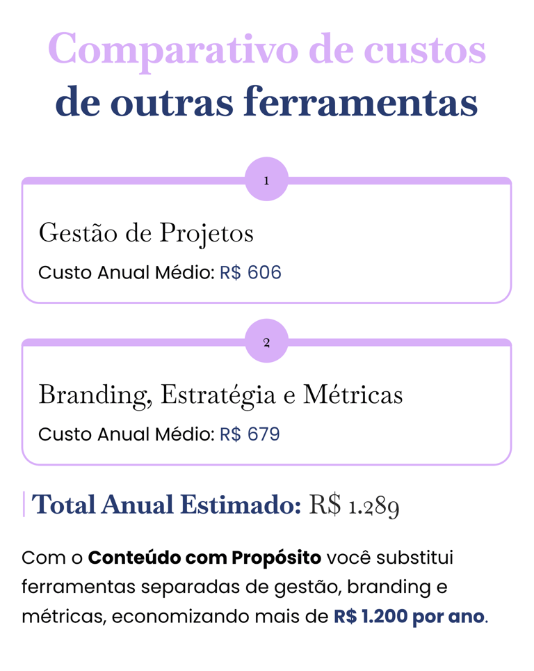 Enquanto ferramentas separadas custam cerca de R$ 1.285 por ano, o Conteúdo com Propósito oferece tudo isso por um investimento único de R$ 497.